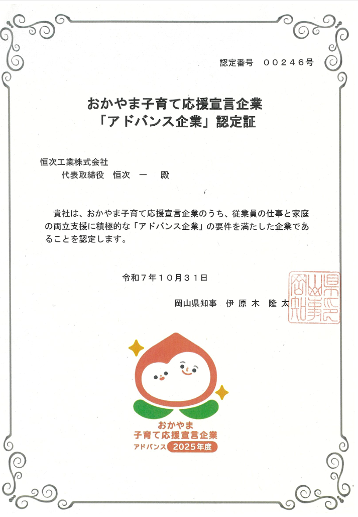 おかやま子育て応援宣言企業【アドバンス企業】の認定 投稿日 2025年10月31日 更新日 2025年12月9日 著者 admin カテゴリー お知らせ この度、おかやま子育て応援宣言企業【アドバンス企業】の認定をいただきました✨これからも社内だけでなく、地域社会の子育てを応援していきます💪 この記事を書いた人 admin 記事一覧